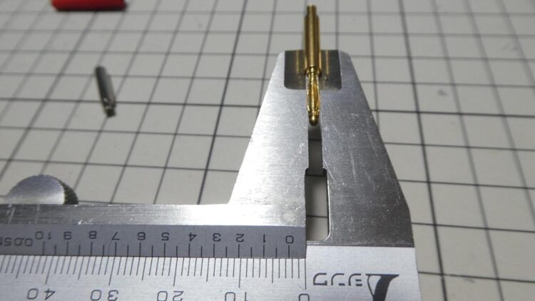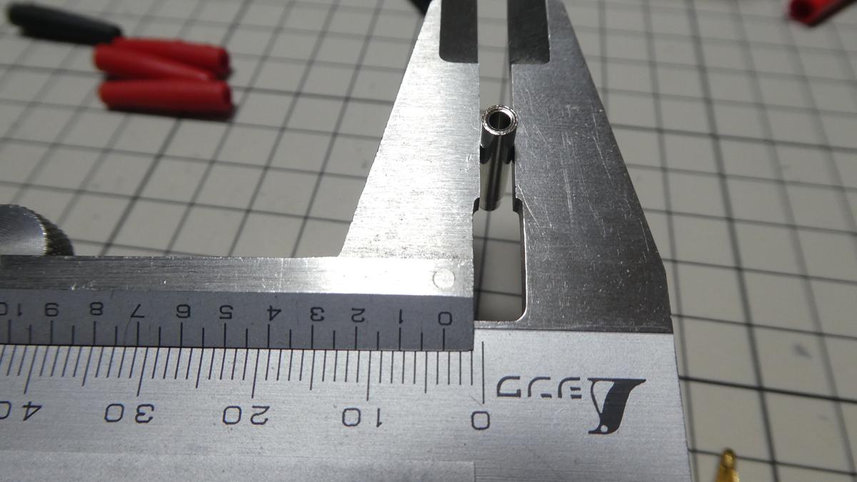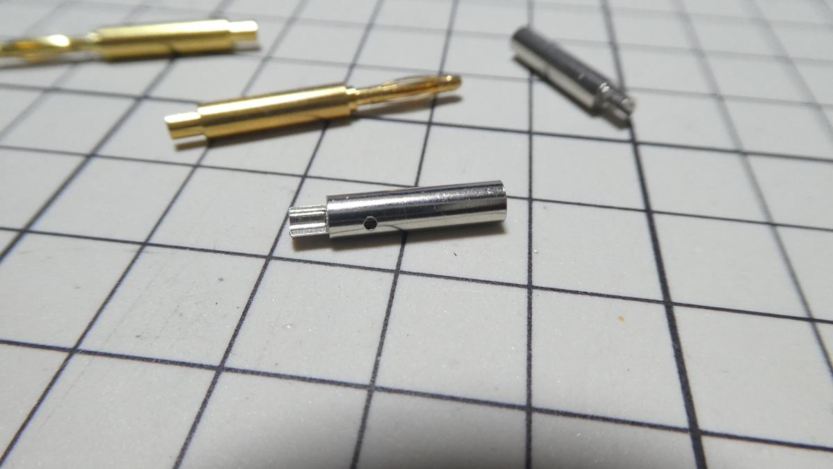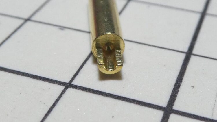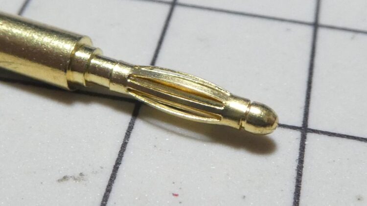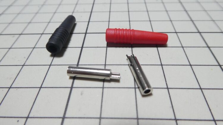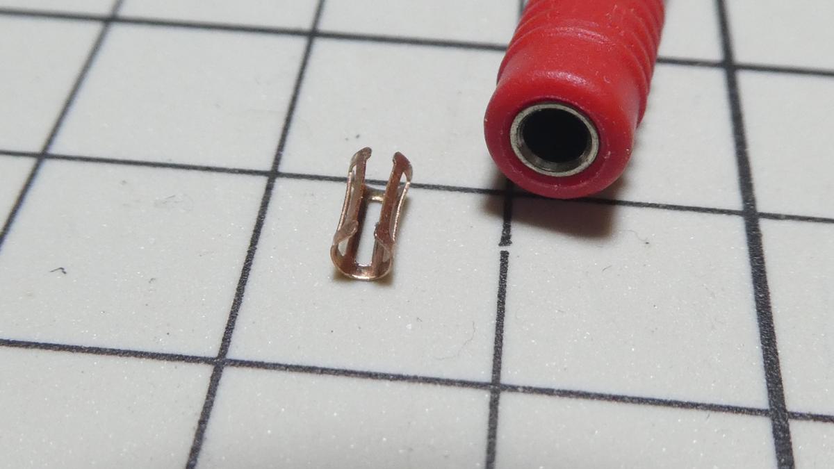 ジャックの方の話なんですが、以前購入した「0.7mm径の極細テストリード」のコネクタには下図のようなパーツが入っていたので2mm径のテストリード(プローブ針)を接続することができたんですが、このバナナジャックの中はただの空洞で何も入っていないのでガバガバで接続できません。