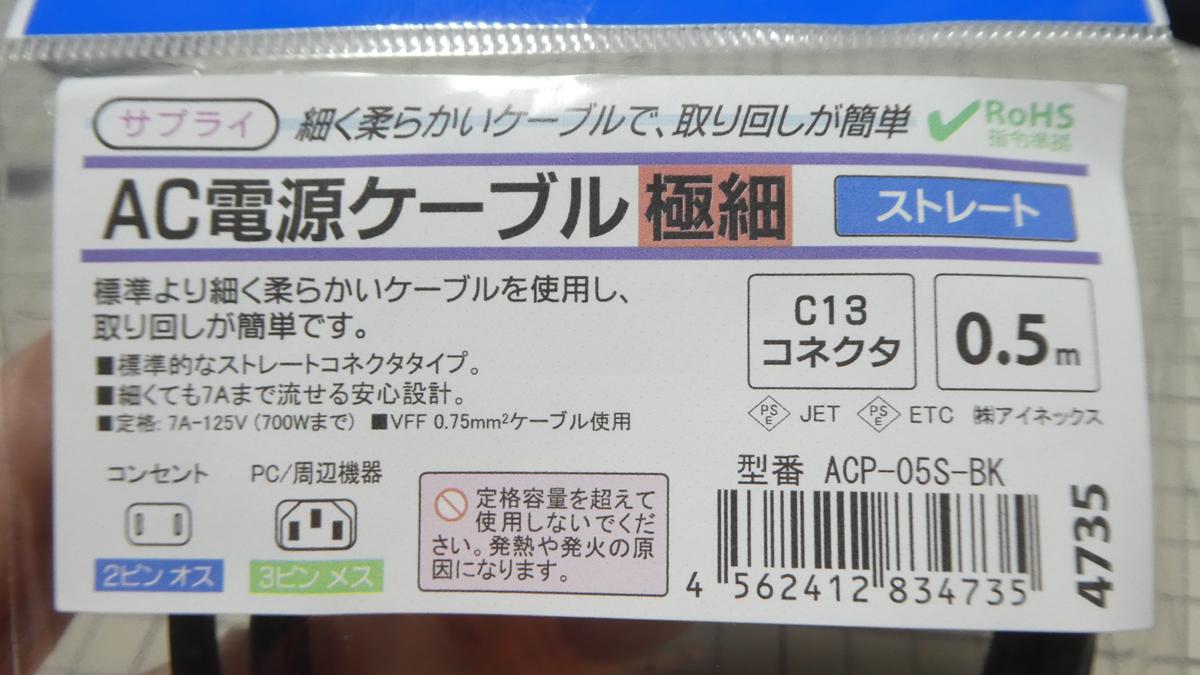 アイネックス 極細AC電源ケーブル 0.5m ACP-05S-BK 購入レビュー