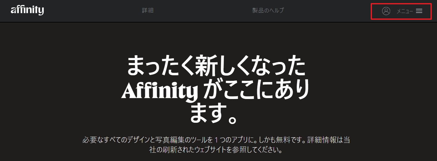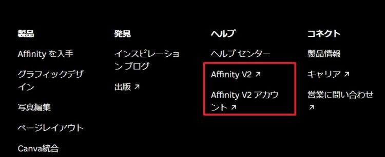 ヘルプやPhotoなどのページを開いて下部のフッターまで移動すると「Affinity V2」と「Affinity V2 アカウント」というリンクがあります。