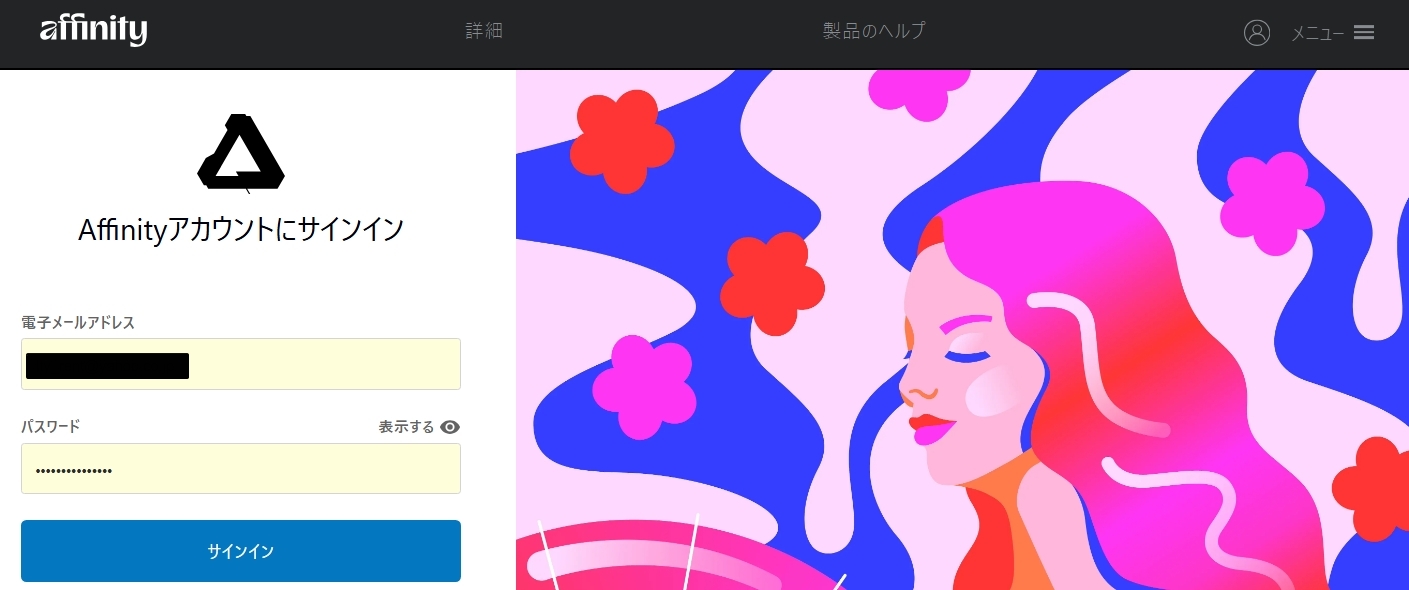 「Affinity V2 アカウント」のリンクを開くとサインイン画面が開きます。
