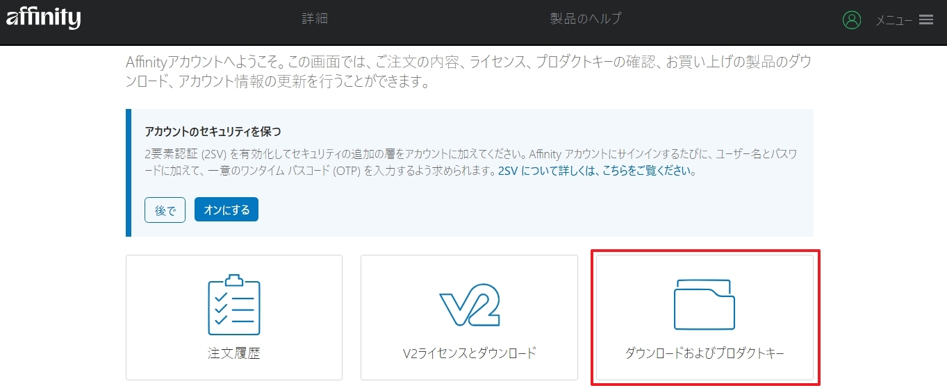 また、「Affinity V2」のリンクを開くと右上にログインメニューが表示され、人のアイコンをクリックすると上の同じ画面が開きます。