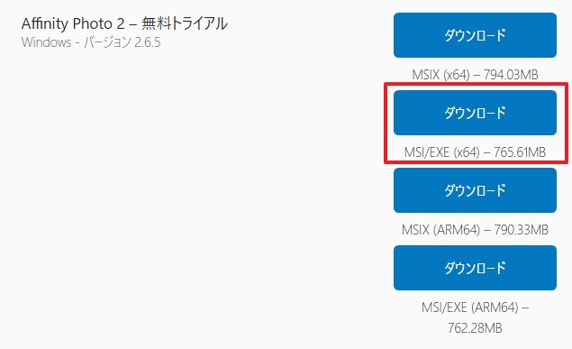 「Affinity Photo 2 – 無料バージョン(Windows – バージョン 2.6.5)」にある「MSI/EXE (x64) – 765.61MB」をクリックしてダウンロード。