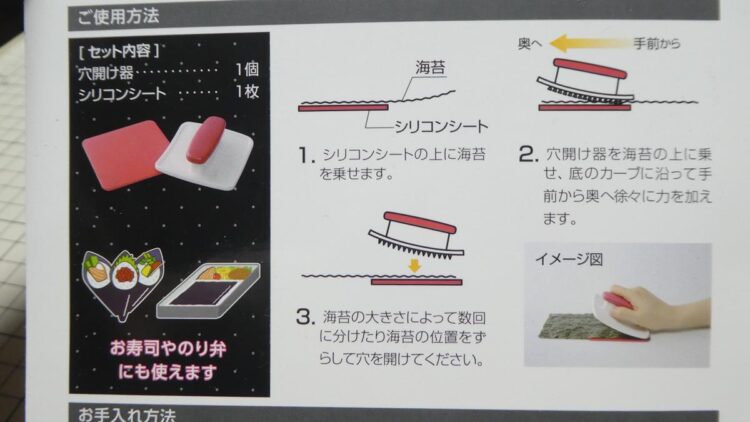 この商品は手巻き寿司やおにぎりなどに巻いた海苔が噛み切れずに食べづらい時がありますがそれを解消する道具です。