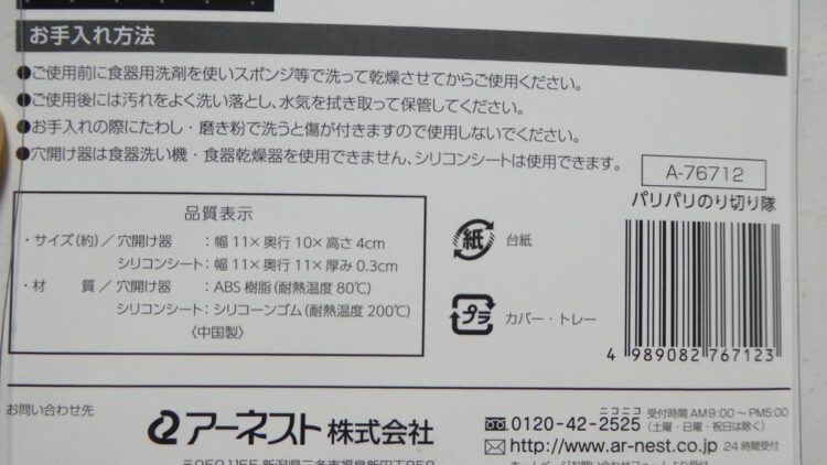 あとトゲトゲ部分がスポンジで洗いにくいですがそんな汚れないので泡で洗い流すだけにしています。因みに穴開け器の耐熱温度は80℃となっているので食洗器や食洗乾燥機では使えないそうです。