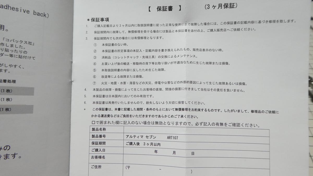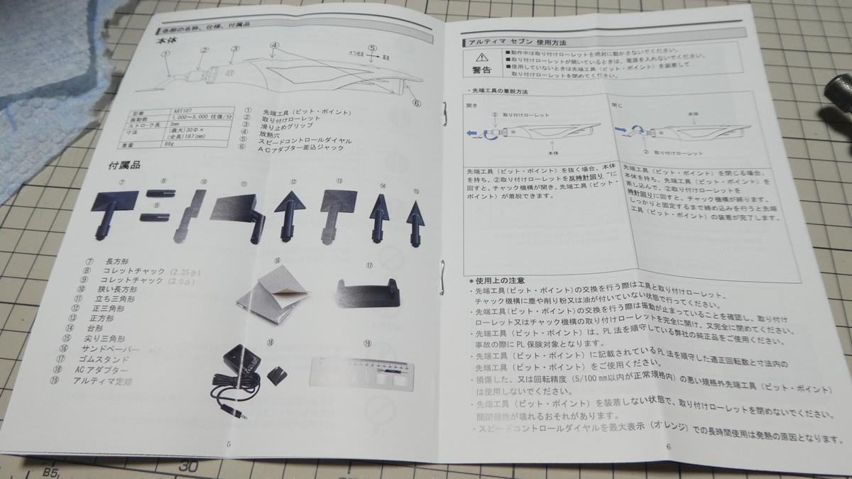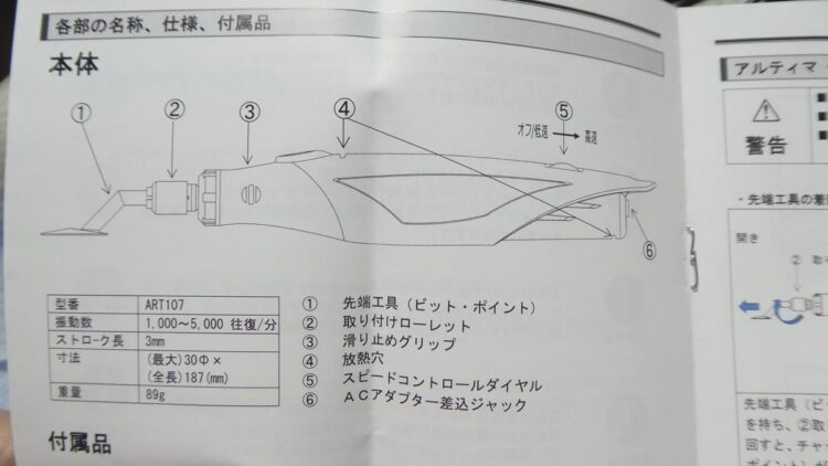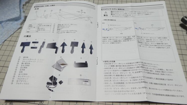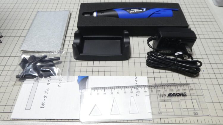 付属品は、アルティマ7本体、定規、ゴムスタンド、アタッチメント、ACアダプタ、紙やすり(10枚)、取扱説明書。