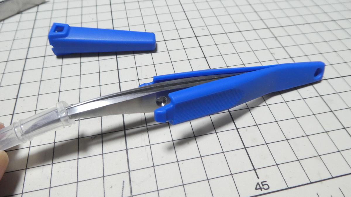 ただ、かなりキツキツで下手したら怪我しそうな気がしたので元々ピンセットについていた保護キャップを嵌めてから差し込みました。