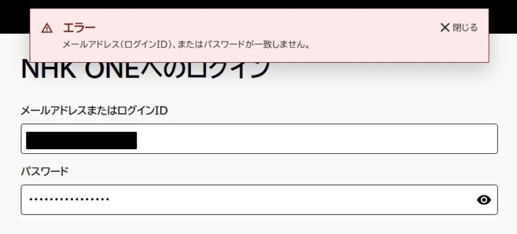 NHKプラスのアカウントがあるので「アカウントをお持ちの方はログイン」に進んでNHKプラスに登録したメールアドレスとパスワードを入力してみたんですがエラーとなってログインできませんでした。