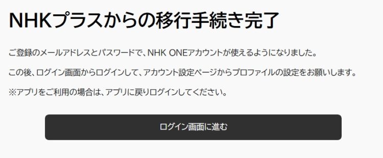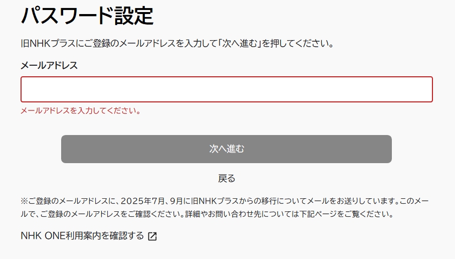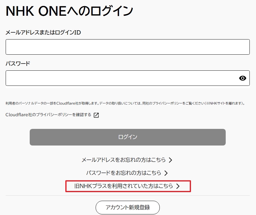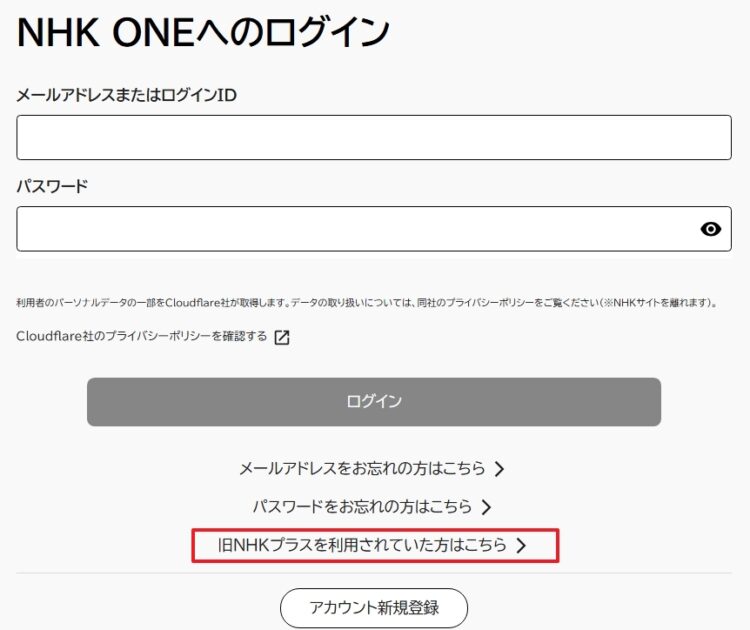 どうもパスワードを再設定する必要があるようなのでログイン画面へ進み、下部にある「旧NHKプラスを利用されていた方はこちら」へ進みました。