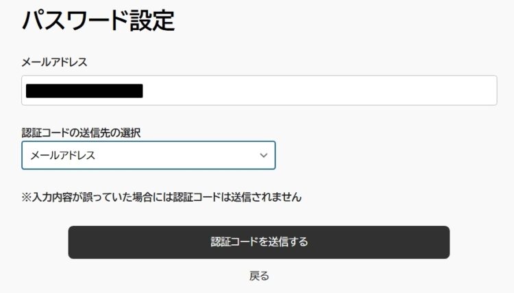 すると認証コードを送信する画面が表示されるので「認証コードの送信先を選択」を「メールアドレス」にして「認証コードを送信する」をクリック。