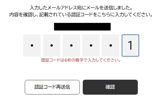 メールアドレスに6桁の認証コードが届くので入力して確認ボタンをクリック。