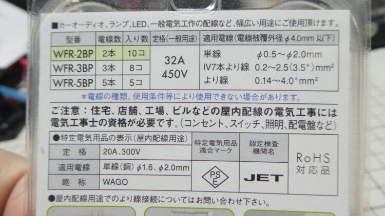 投稿日:2025/10/25 更新:2025/10/25 コメント 0件 工具 WAGO, ケーブル, コネクタ, ワゴ色々なシーンでケーブル同士の接続に使えそうなので「ワゴジャパン WFRシリーズ ワンタッチコネクター ブリスターパック 電線数2本 10個入 WFR-2BP オレンジ」を買ってみました。価格はアマゾンで626円でした。